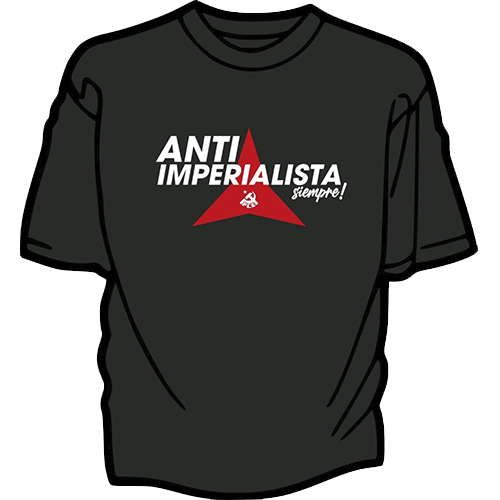 Camiseta 100 % algodón, con eslogan «Anti Imperialista Siempre» en color blanco, con símbolos de la estrella en color rojo de las Brigadas Internacionales y logotipo del Partido Comunista de España en color blanco.